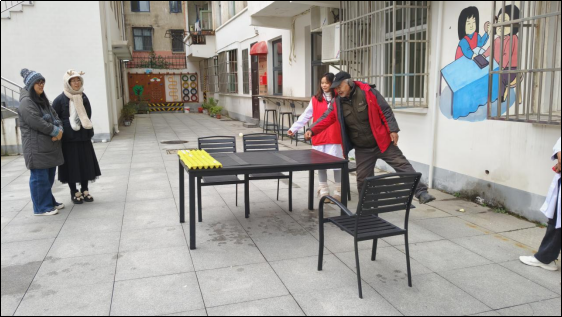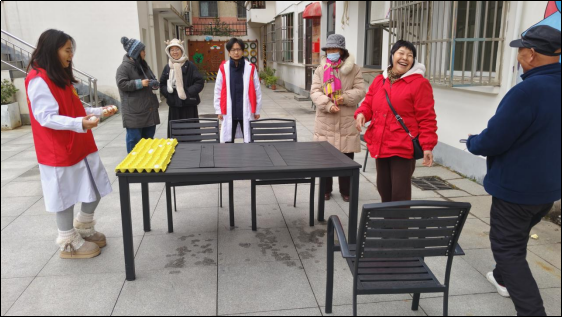 活动室内专注温馨,室外则是欢声笑语。为增添冬至节日气氛,促进邻里情感交流,志愿者们精心设计了趣味“冬至弹球”游戏。居民们手持乒乓球,在桌边巧妙轻弹,成功将球送入托盘即可赢得象征团圆美满的鸡蛋。游戏规则简单却充满互动乐趣,小小的鸡蛋不仅带来了收获的喜悦,更承载着志愿者们对社区居民“团圆安康”的美好祝愿。