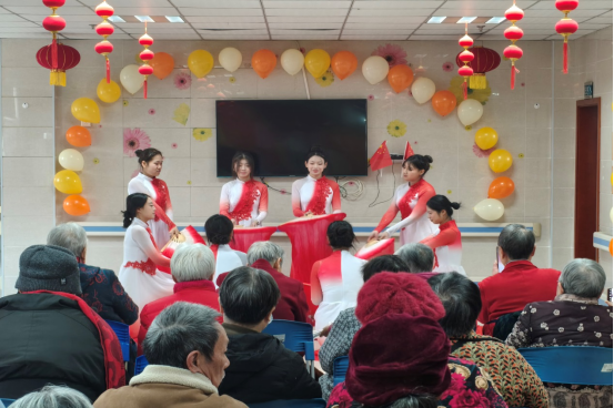 紧接着,志愿者们与福利院老人同台献艺,共同呈现了一场充满温情与活力的联欢。医学院大学生志愿者带来了舞蹈《光亮》《卜卦》,学生们用青春的舞姿传递温暖与希望;歌曲《送你一朵小红花》由学生与老人共同演绎,彰显了跨代际的情感交融。老人们也踊跃展示才艺,邓少华教授领衔的儿歌合唱《劳动最光荣+早操歌》活泼动人,陈林枝、乐静宁等老同志的独唱深情激昂,湛玉梅老人的京剧选段韵味悠长,展现出老人们积极乐观的精神风貌。朗诵《元启新程,致敬桑榆》《我的祖国》等节目,则表达了大家对祖国的热爱与对晚年生活的美好祝愿。